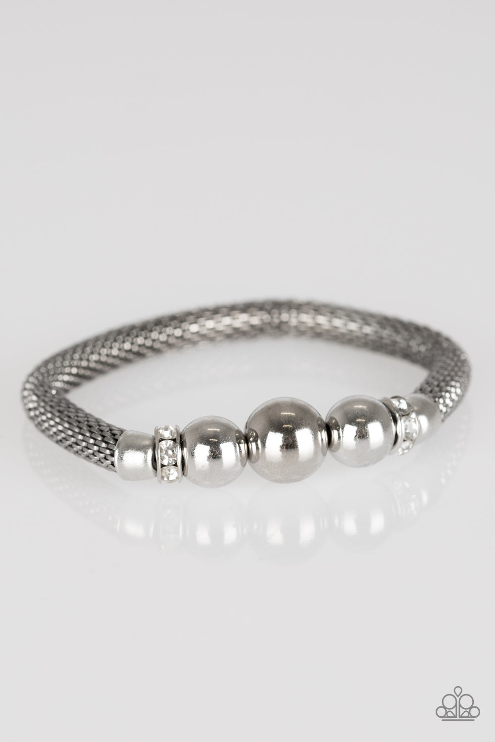 Rounded silver mesh-chain and classic silver beads are threaded along a stretchy elastic band. White rhinestone encrusted rings flank the silver beads, creating an edgy centerpiece.