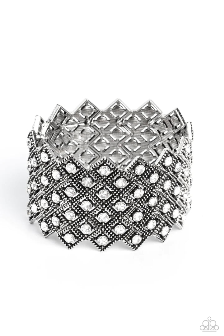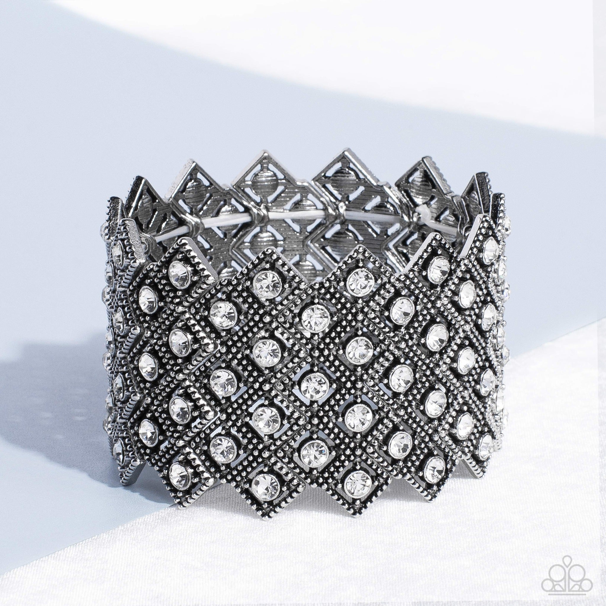 Glittery silver-studded diamond frames filled with white rhinestones cluster together in a geometric pattern around the wrist on elastic stretchy bands for a glitzy art deco finish.