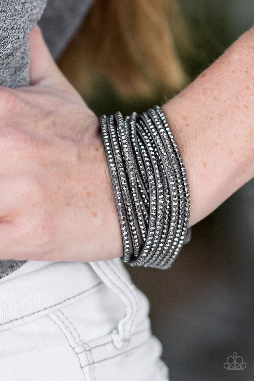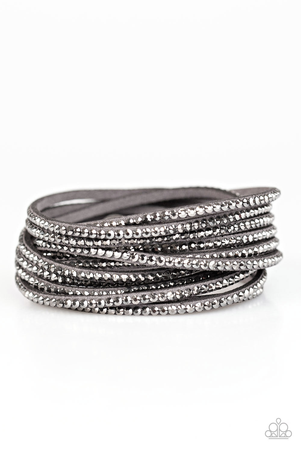 Gray suede is spliced into six strands and embellished with rows of hematite rhinestones for a glitzy combination. The elongated leather band allow for a trendy double wrap design. Features an adjustable snap closure.