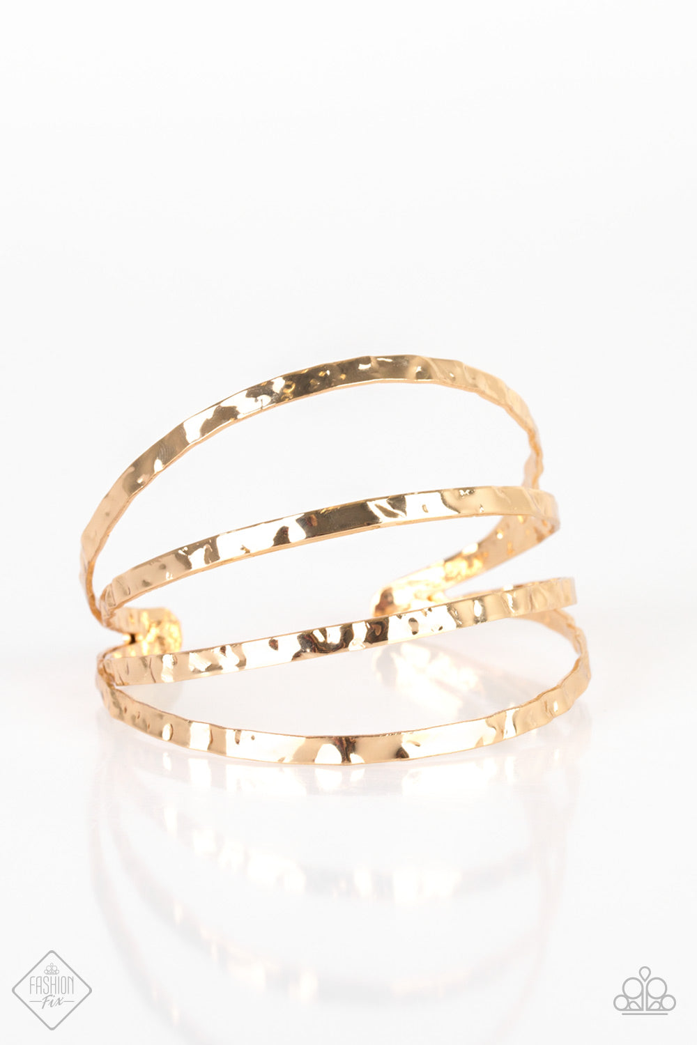Delicately hammered in shimmery textures, glistening gold bars arc across the wrist, coalescing into an airy cuff.