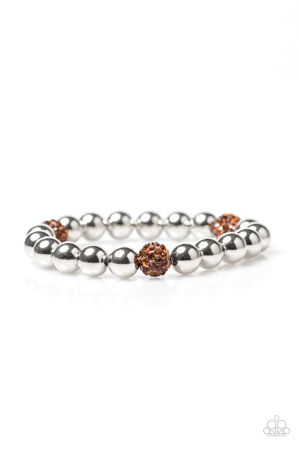 Shiny silver beads are threaded along a stretchy elastic band. Encrusted in brown rhinestones, glittery accents are added to the classic beading for an edgy look.