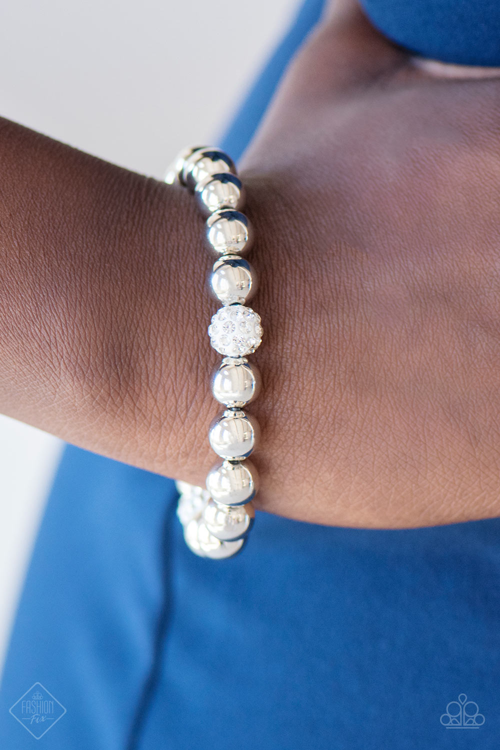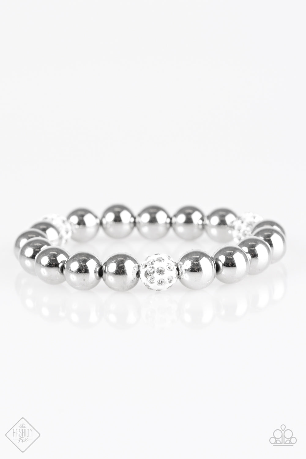 Shiny silver beads are threaded along a stretchy elastic band. Encrusted in brown rhinestones, glittery accents are added to the classic beading for an edgy look.