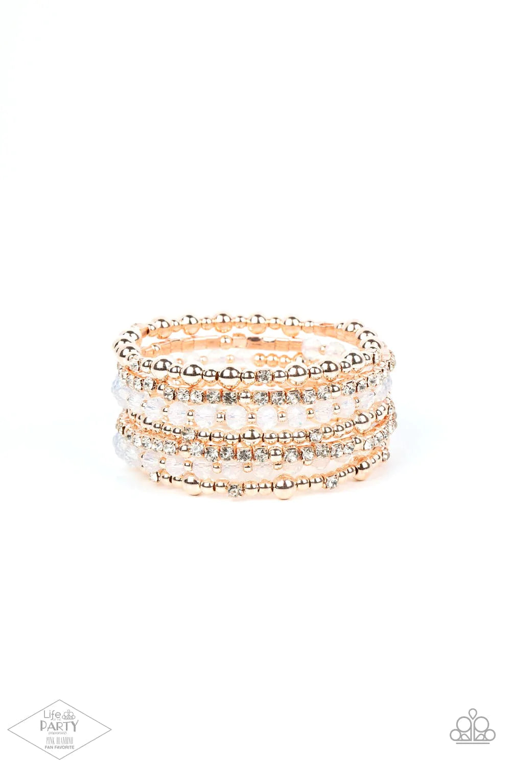 An icy collection of rose gold beads, rose gold cubes, opaque crystals, and glassy white rhinestones are threaded along a coiled wire, creating a blinding infinity wrap style bracelet around the wrist.