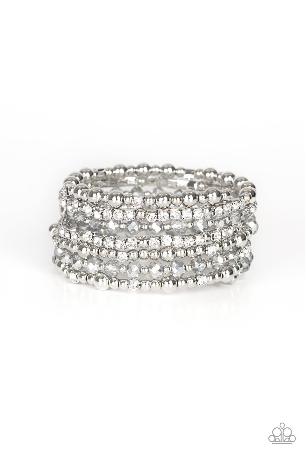 An icy collection of silver beads, silver cubes, white crystals, and glassy white rhinestones are threaded along a coiled wire, creating a blinding infinity wrap style bracelet around the wrist.