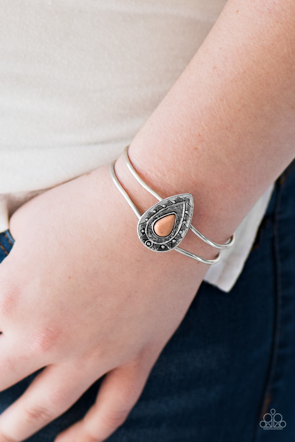 A smooth brown stone is pressed into the center of a teardrop frame for an earthy look. Embossed in a radiant tribal pattern, the colorful centerpiece attaches to curling silver bars for a seasonal finish. Features an adjustable hinged closure.