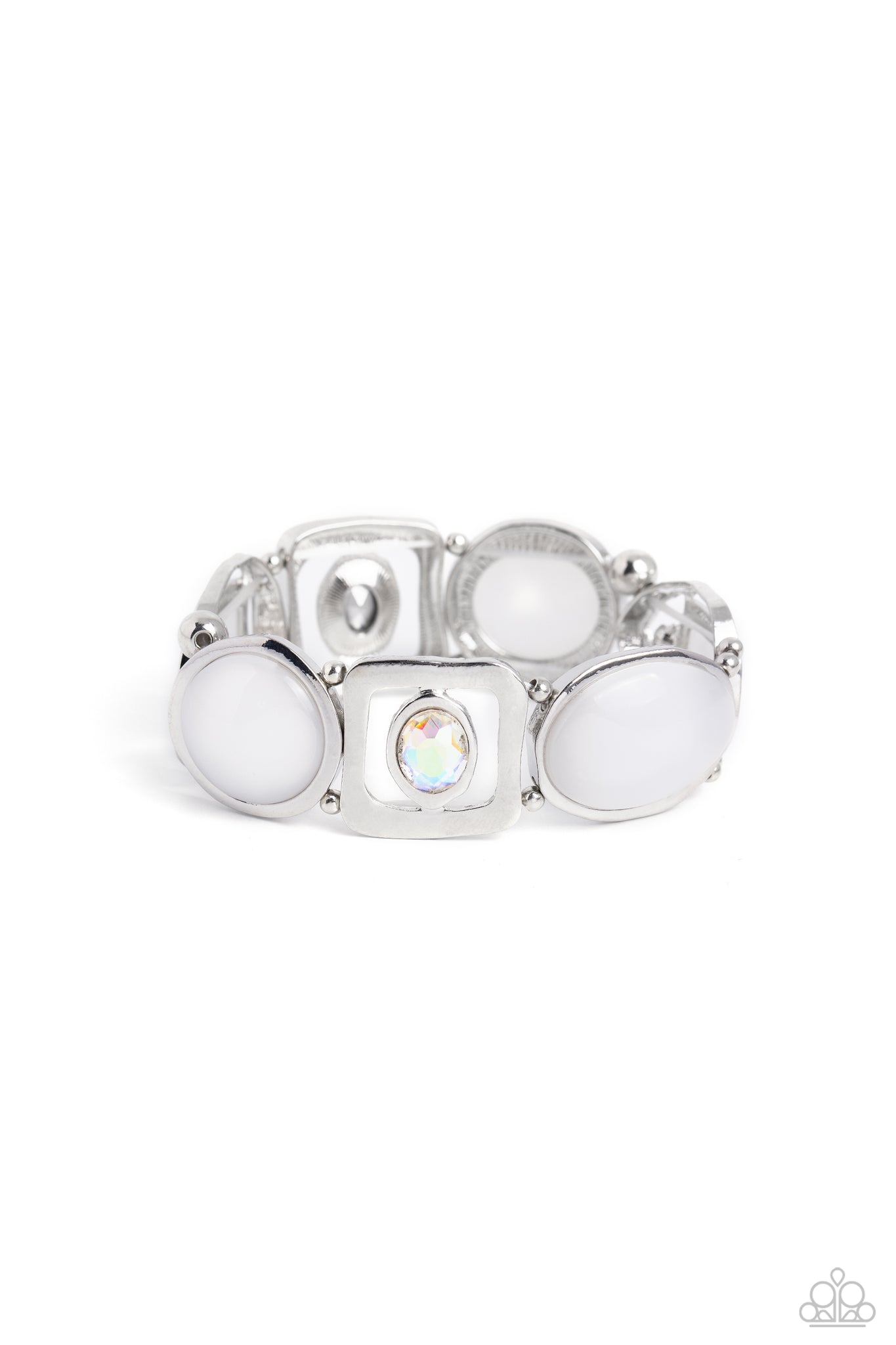Featuring white milky acrylic beads, a mismatched collection of asymmetrical silver circle, square, and teardrop frames link around the wrist on an elastic stretchy band. Silver beads in various sizes separate each shape, while accents of white glitz and iridescent beads unite into a glitzy mashup around the wrist. Due to its prismatic palette, color may vary.