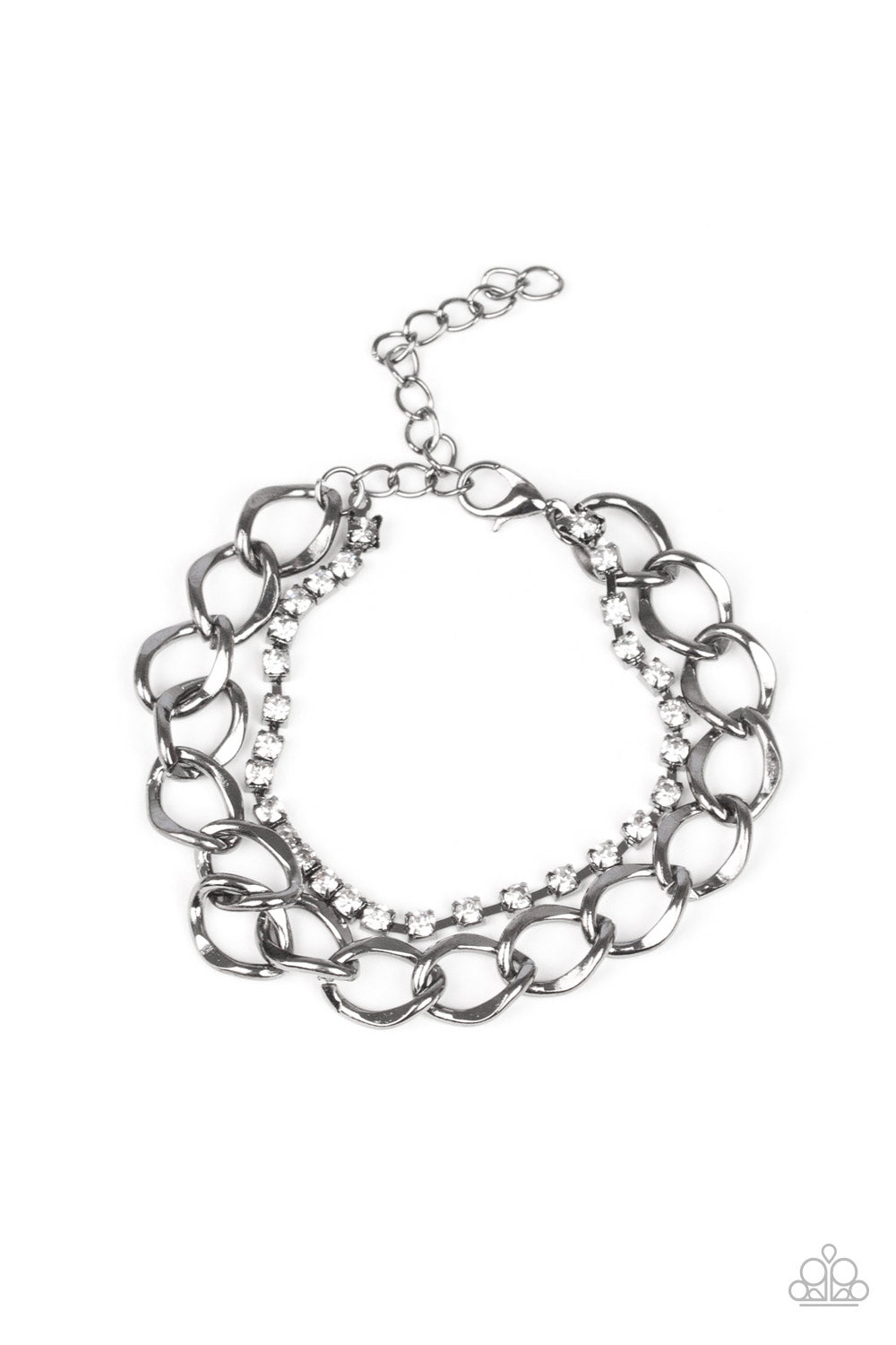 Pressed into sleek square frames, a strand of glittering white rhinestones joins a bulky gunmetal chain around the wrist for an edgy-glam look. Features an adjustable clasp closure.