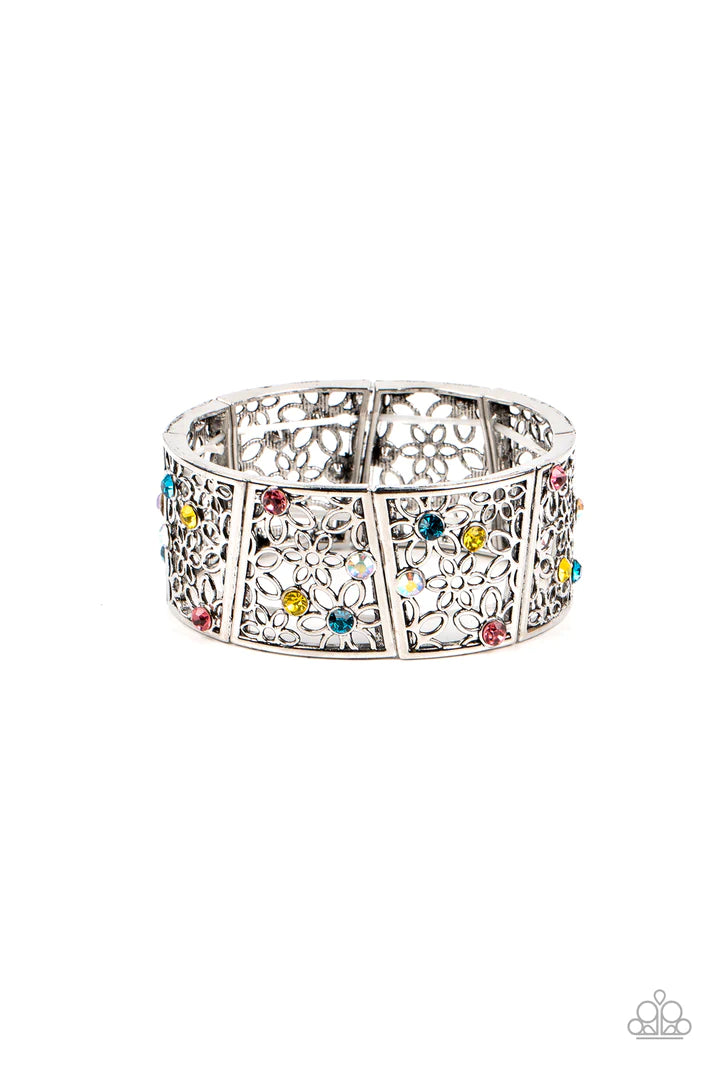 Sporadically dotted with multicolored and iridescent rhinestones, an airy daisy pattern blooms inside trapezoidal silver frames that are threaded along stretchy bands around the wrist for a seasonal statement. Due to its prismatic palette, color may vary.