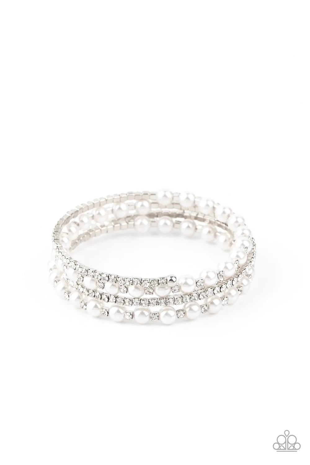 Row after row of glassy white rhinestones and classic white pearls coil around the wrist, creating a blinding infinity wrap bracelet.