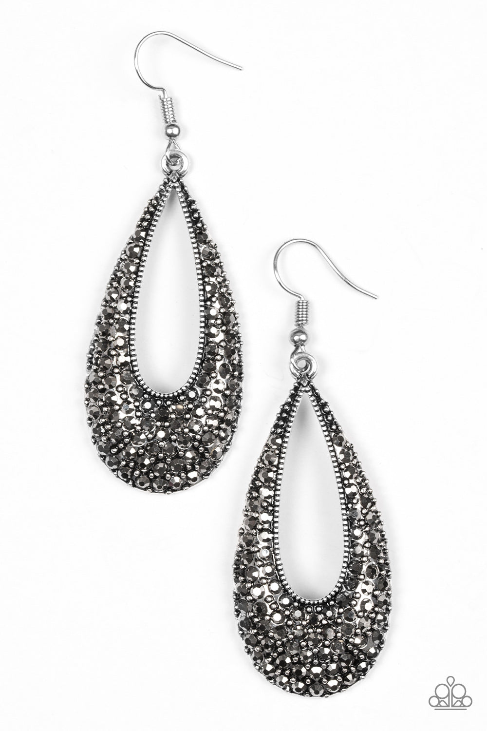 As if dipped in glitter, an airy teardrop lure is encrusted in row after row of glittery hematite rhinestones for a dramatic look. Earring attaches to a standard fishhook fitting.