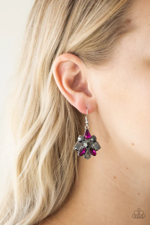 Varying in cut and shimmer, glittery pink and hematite rhinestones coalesce into a blinding lure for a dramatic look. Earring attaches to a standard fishhook fitting.