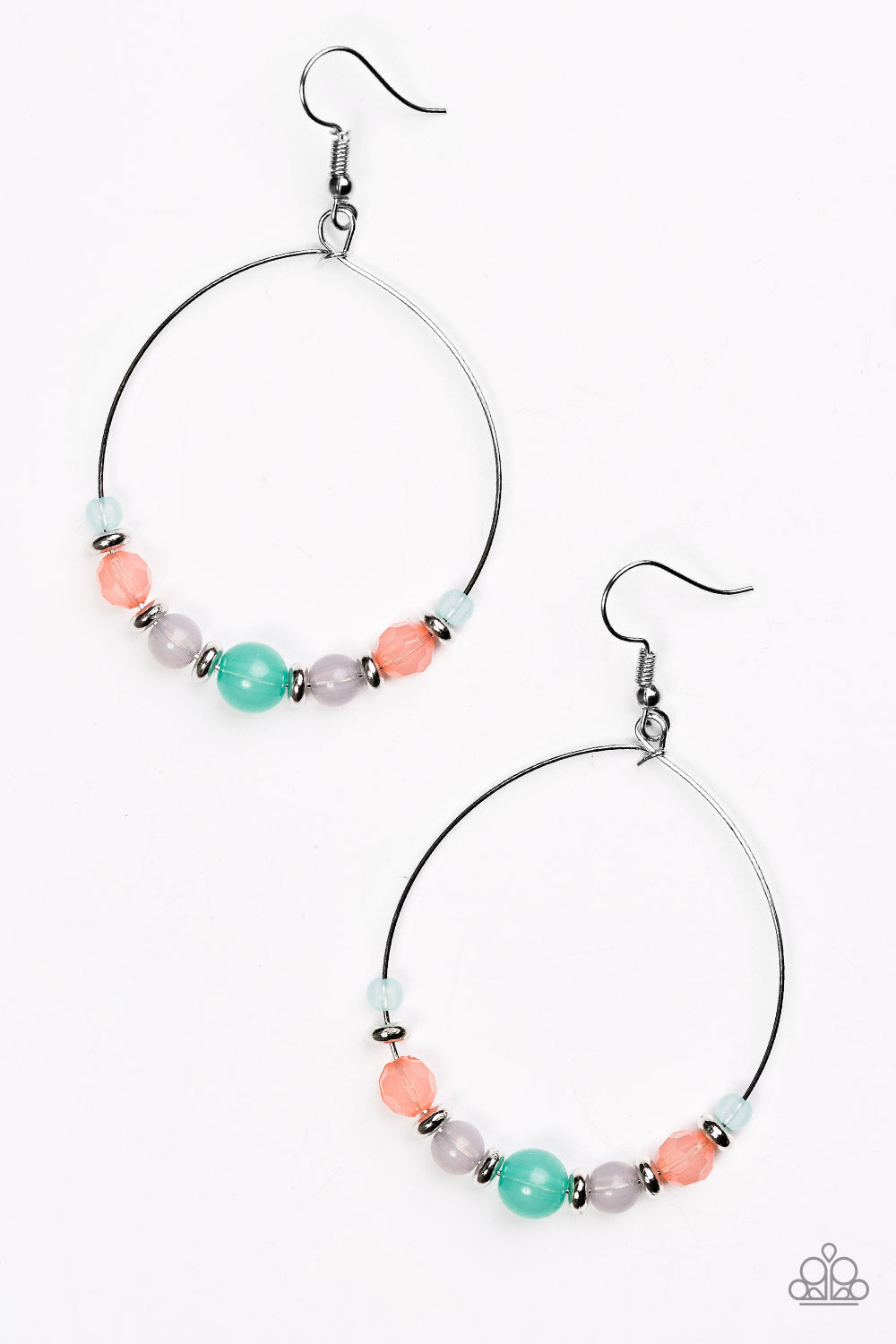 Featuring an opaque finish, faceted and smooth beads join shimmery silver accents along a silver hoop for a whimsical look. Earring attaches to a standard fishhook fitting.