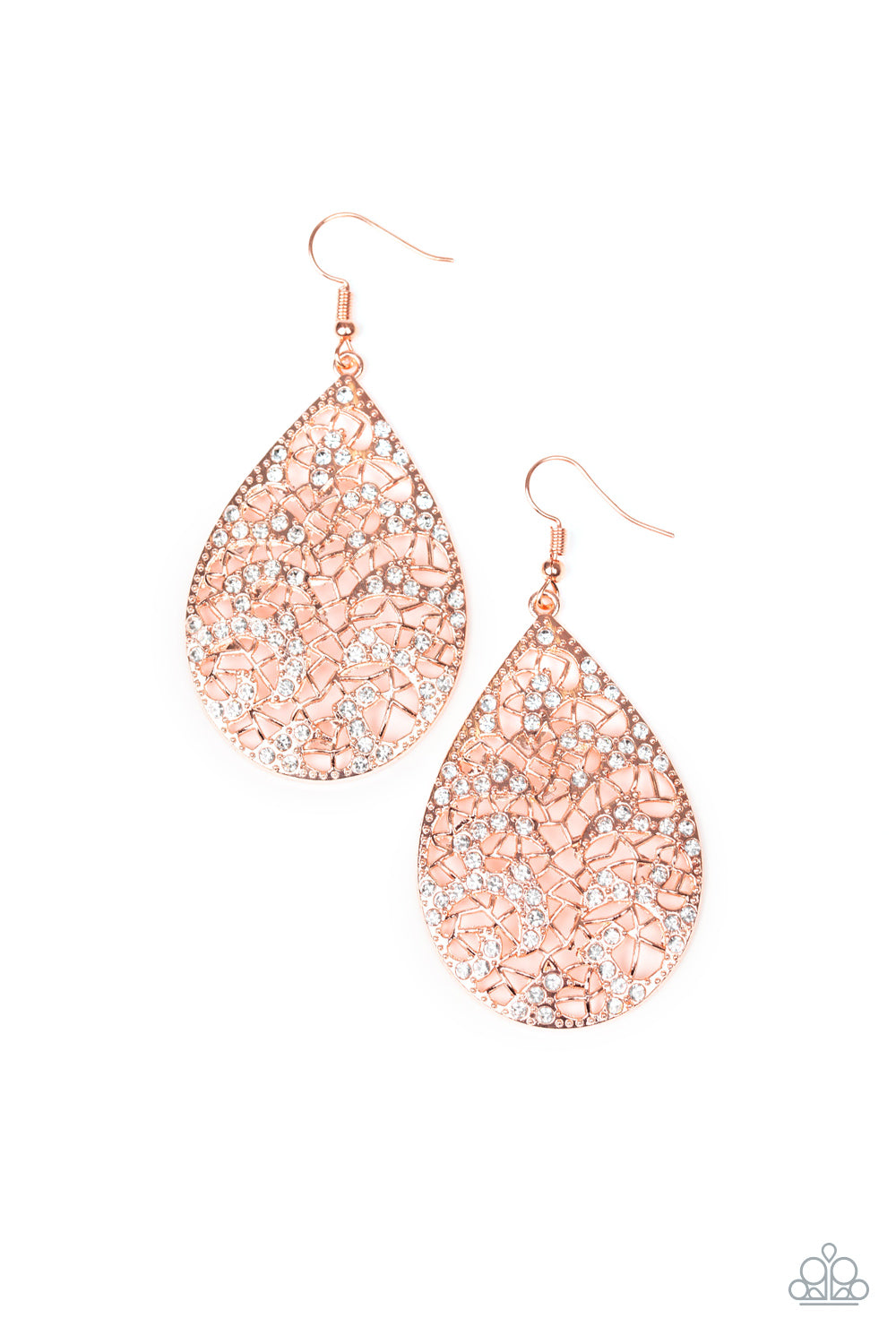 Dainty white rhinestones are sprinkled across a shiny copper teardrop radiating with stenciled filigree for a whimsical look. Earring attaches to a standard fishhook fitting.