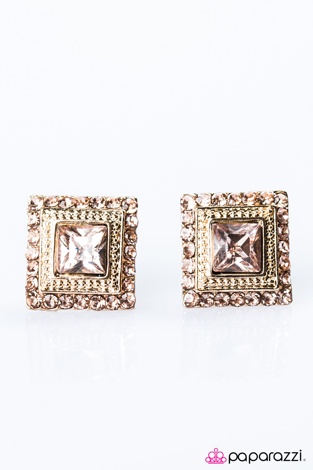 Glittery peach rhinestones are sprinkled across a square gold frame. Chiseled into a sparkling cube, a larger peach rhinestone adorns the center of the frame for a flashy finish. Earring attaches to a standard post fitting.