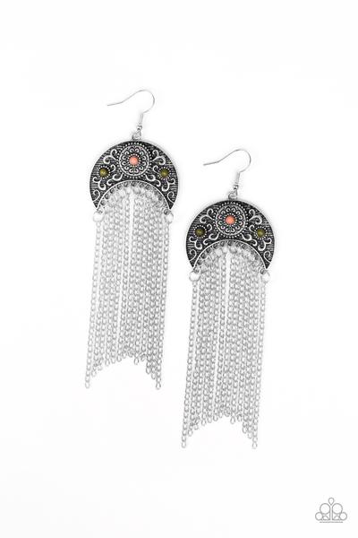Dotted with dainty coral and green beads, an ornate silver half-moon frame gives way to sparkling silver chain fringe for a wanderlust vibe. Earring attaches to a standard fishhook fitting.