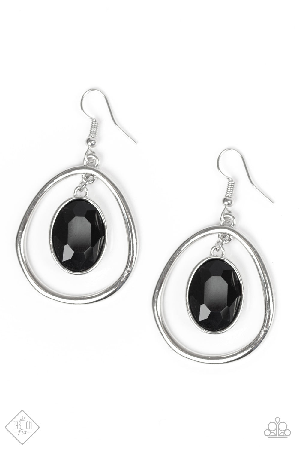 Encased in a sleek silver frame, a faceted black gem is suspended from the top of a shimmery silver teardrop, creating a refined lure. Earring attaches to a standard fishhook fitting.