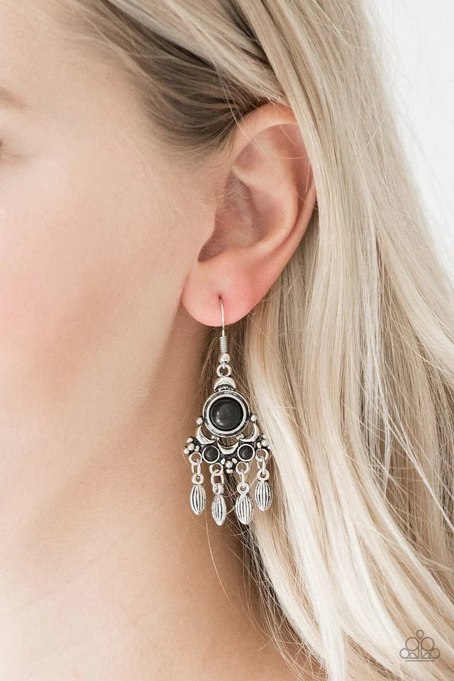 Dotted with earthy black stone accents, an ornate silver frame gives way to a silver beaded fringe for a seasonal look. Earring attaches to a standard fishhook fitting.