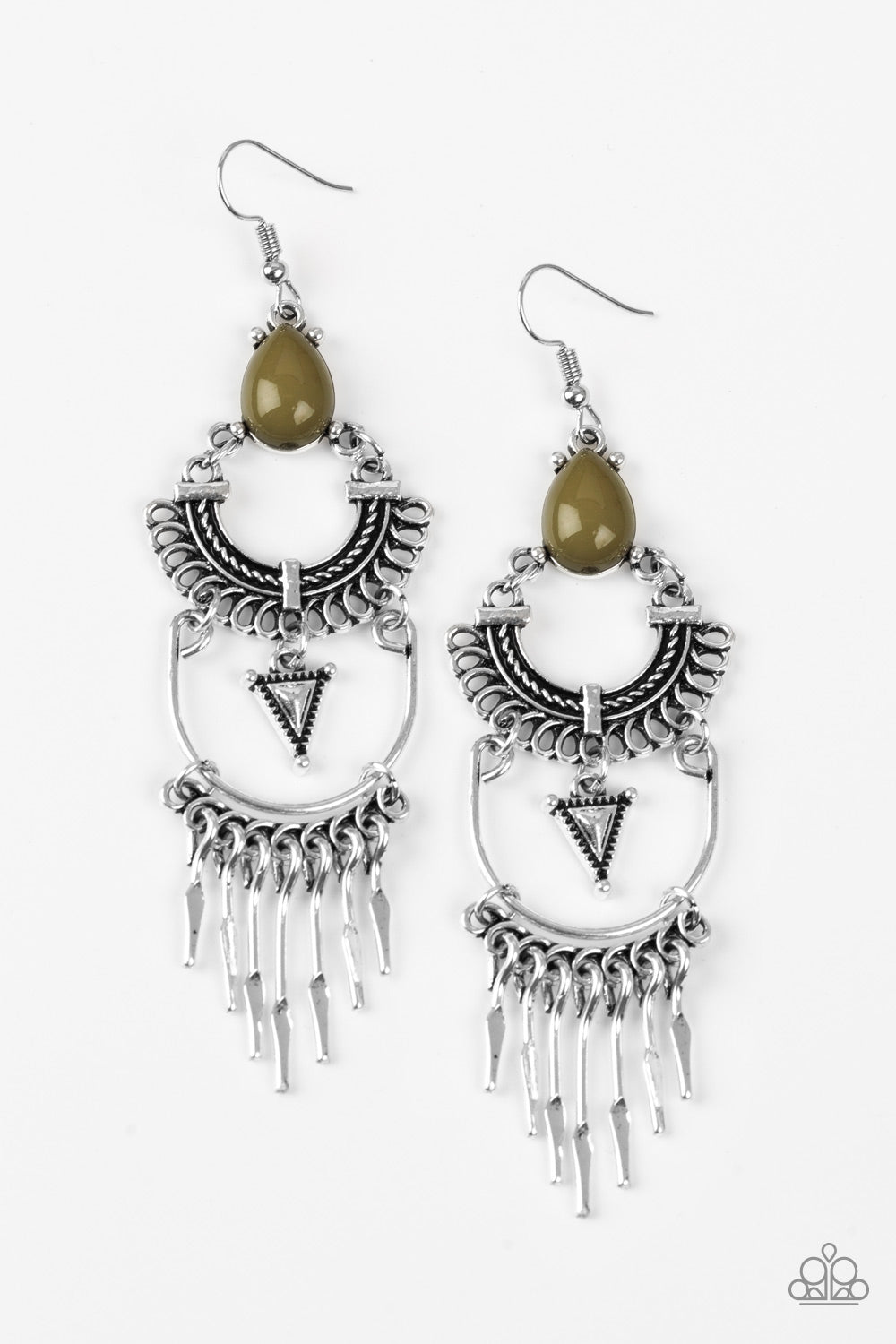 A Martini Olive teardrop bead sits atop stacked silver frames that are linked together to allow flowy movement. Featuring tribal inspired patterns, the dramatically stacked frames give way to flared rods for an edgy fringed finish. Earring attaches to a standard fishhook fitting.