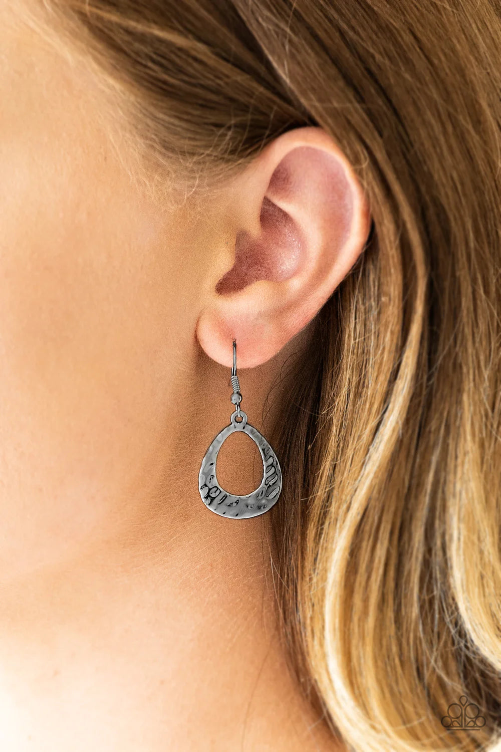 A dainty hammered gunmetal teardrop swings from the ear for a rustic look. Earring attaches to a standard fishhook fitting.