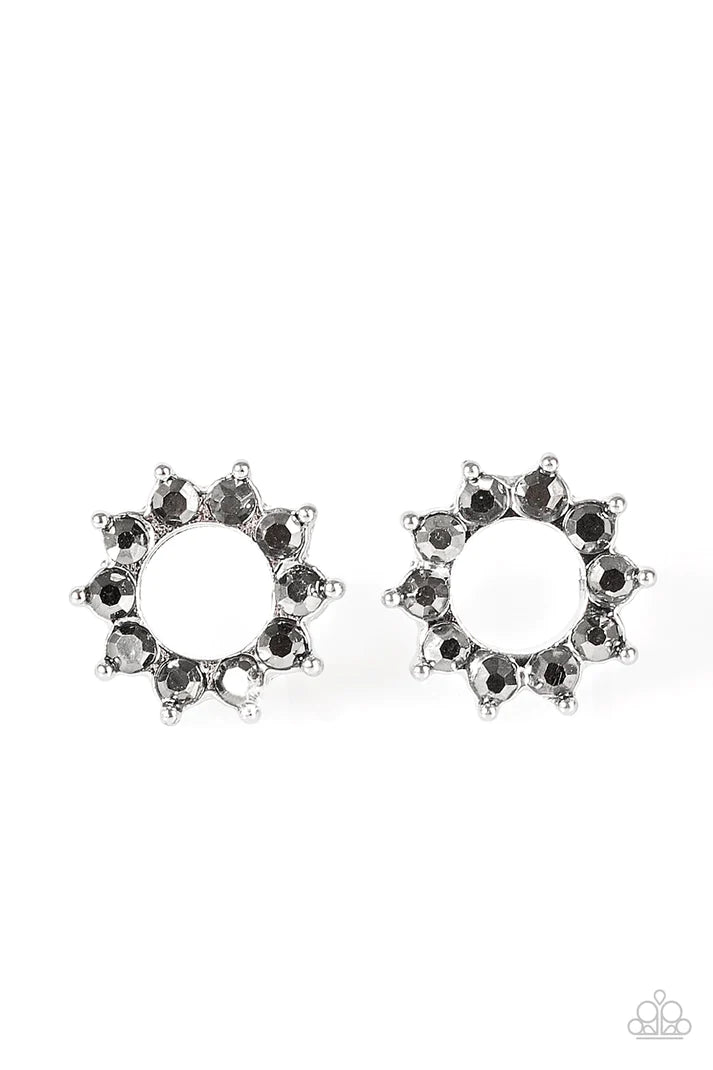 Glittery hematite rhinestones are encrusted along a radiating silver frame, creating a resplendent frame. Earring attaches to a standard post fitting.