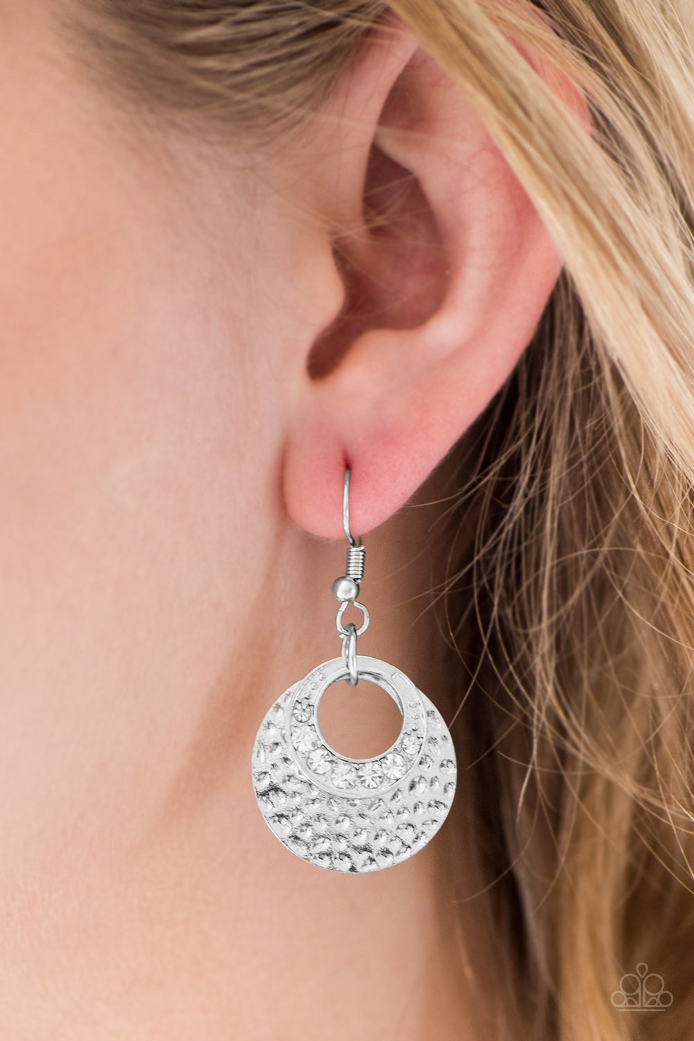A delicately hammered and white rhinestone encrusted hoop swings from the ear, creating a glamourous lure. Earring attaches to a standard fishhook fitting.