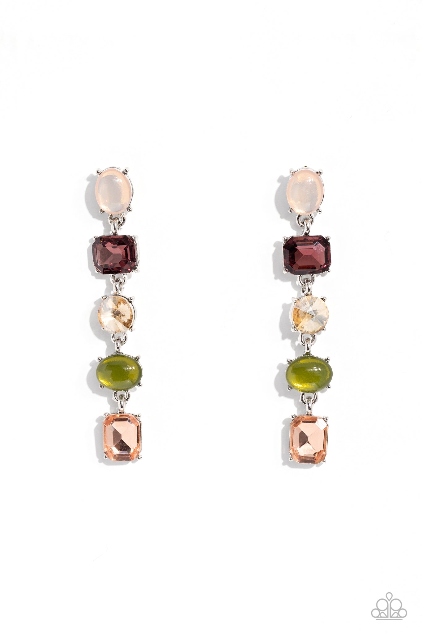 Featuring various opacities, sheens, and cuts, five multicolored rhinestones, set in dainty silver pronged settings, stack one over the other, creating a refined lure with a dash of color and sparkle. Earring attaches to a standard post fitting.