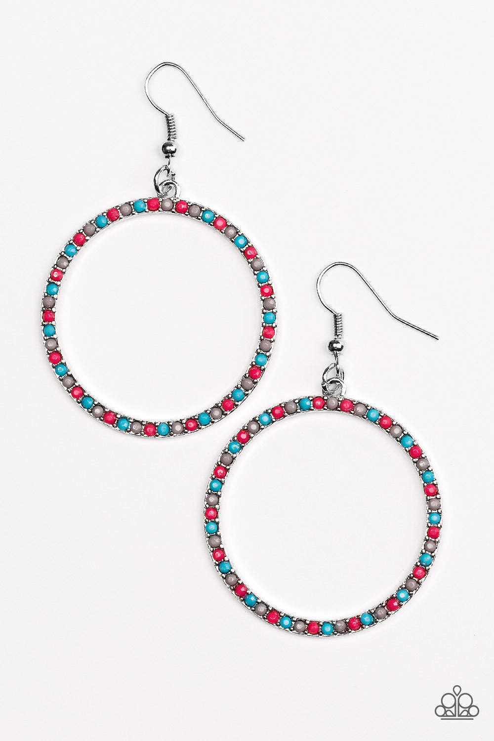 Dainty blue, gray, and pink beads are encrusted along a shimmery silver hoop for a perfect pop of seasonal color. Earring attaches to a standard fishhook fitting.