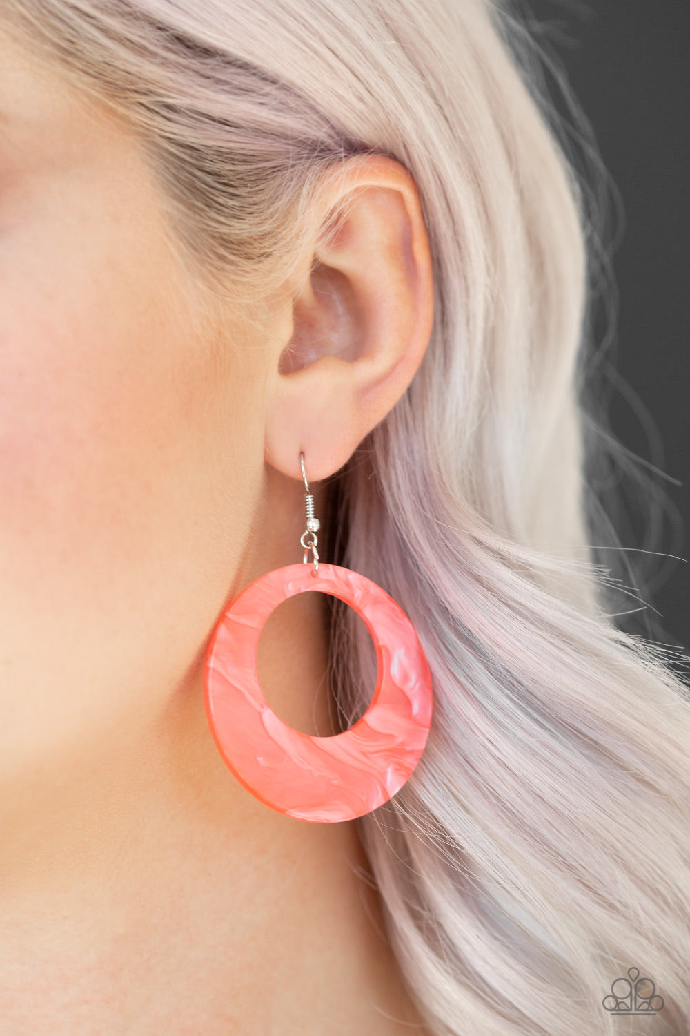 Brushed in a shell-like iridescence, a shiny coral hoop swings from the ear for a summery look. Earring attaches to a standard fishhook fitting.