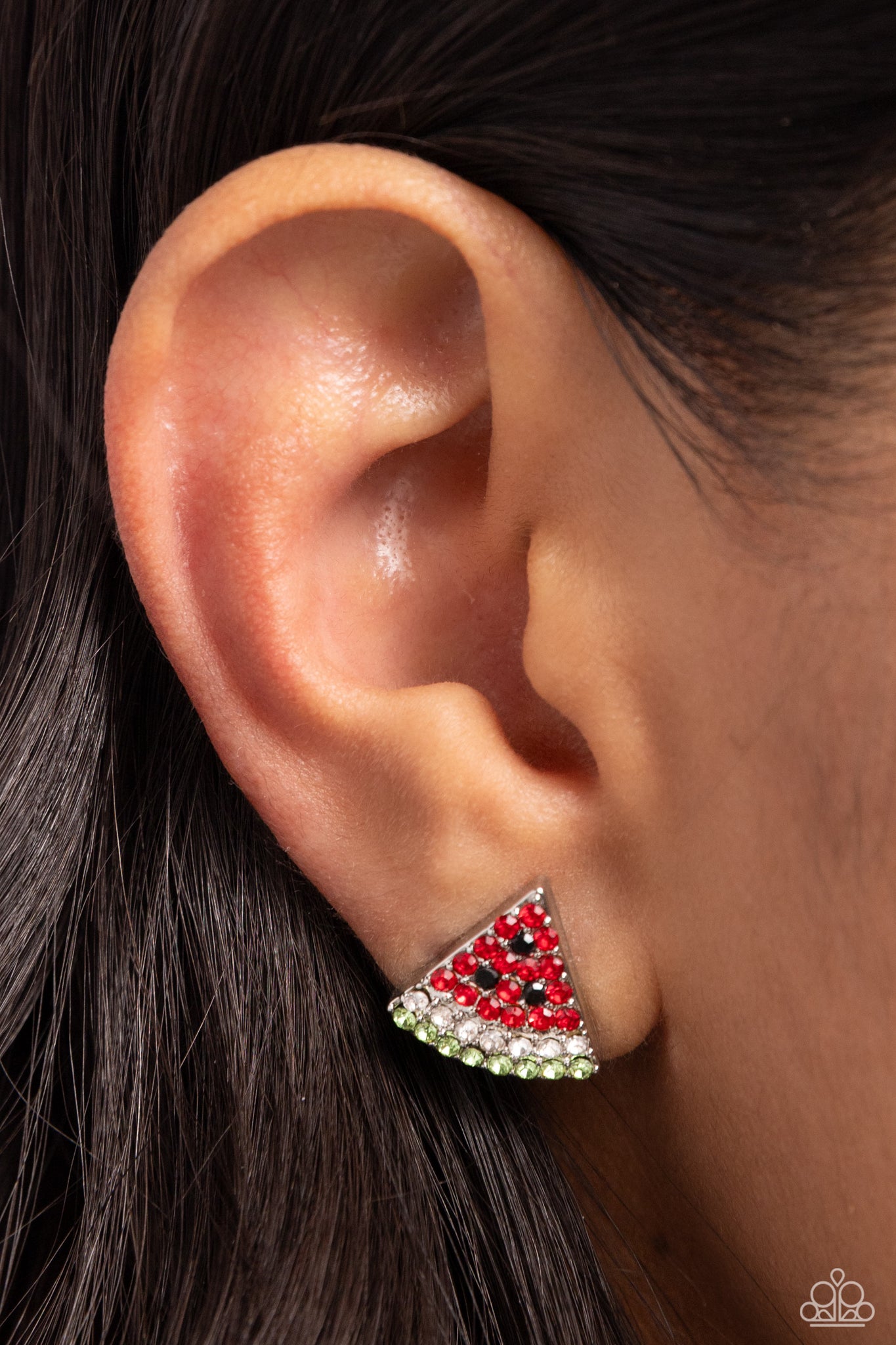 Featuring red, black, white, and green rhinestones, a silver watermelon-inspired post glitters from the ear for a fresh, fruity design. Earring attaches to a standard post fitting.