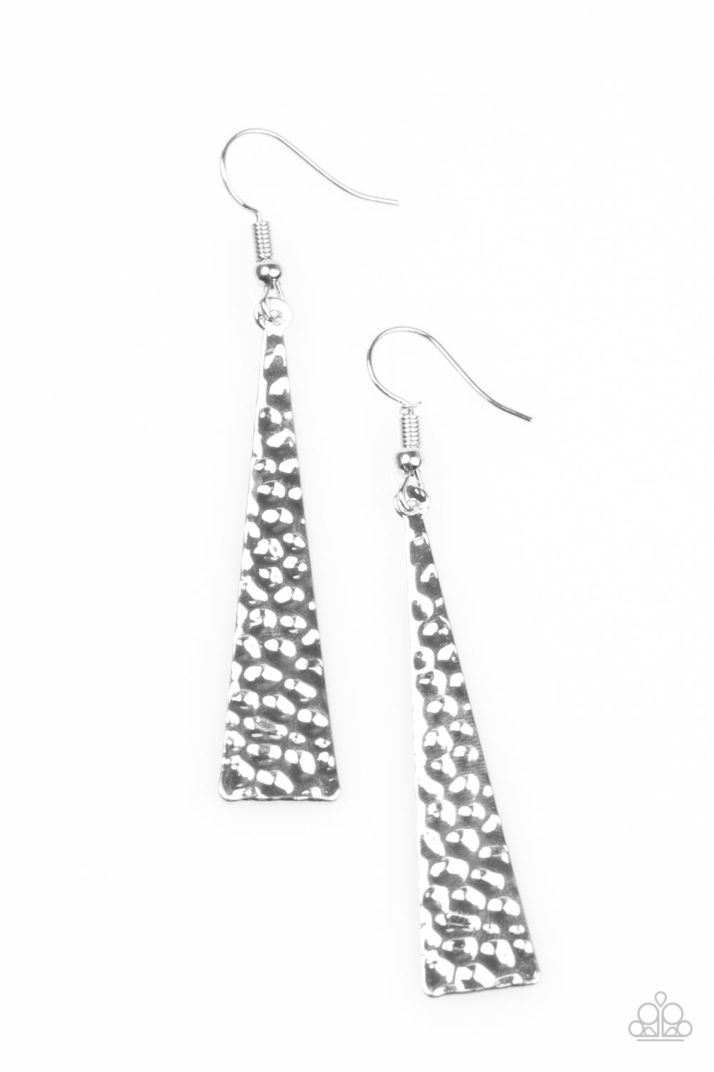 Hammered in endless shimmer, a triangular silver plate swings from the ear in a fierce fashion. Earring attaches to a standard fishhook fitting.