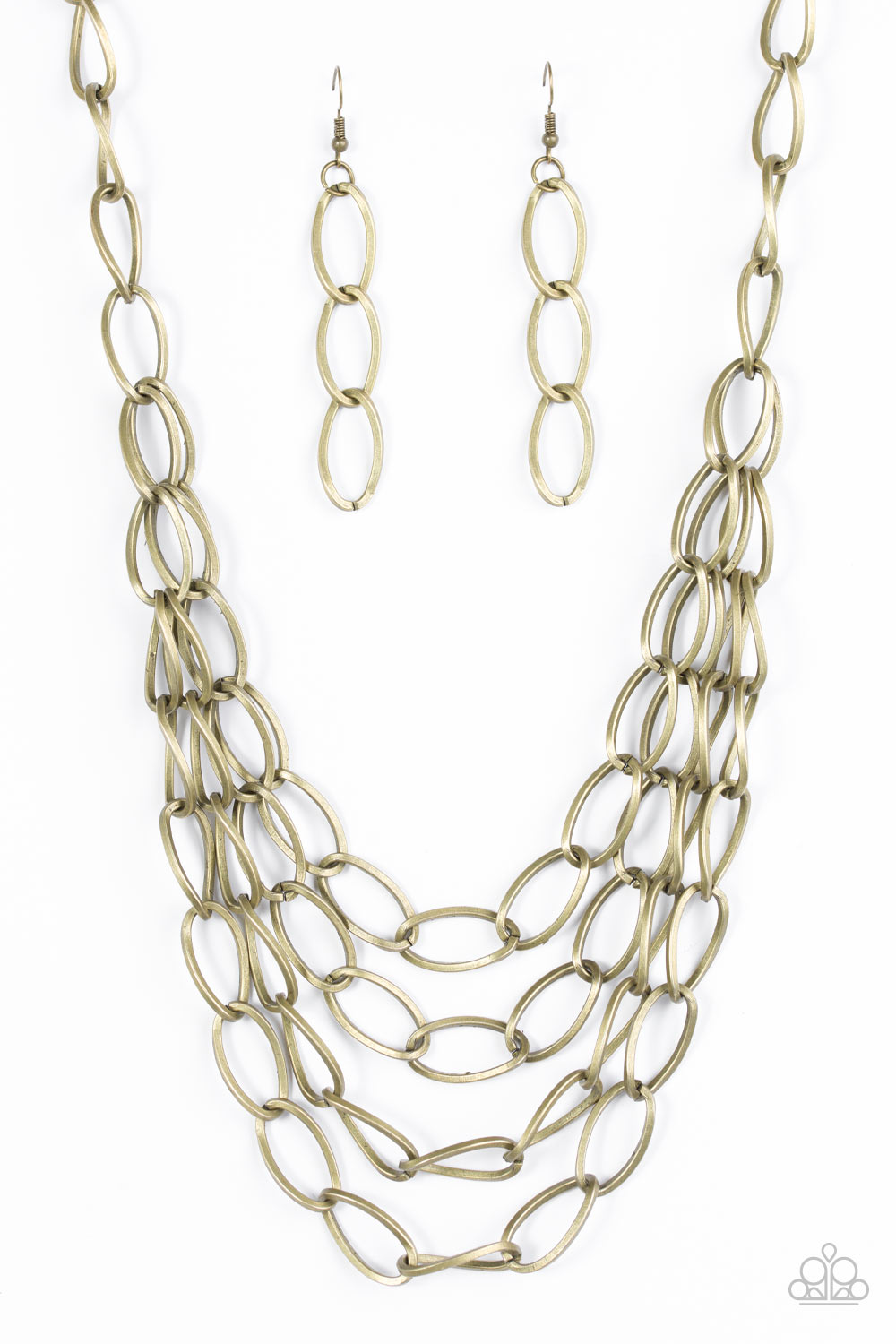 Featuring a subtle twist, glistening brass links join below the collar in four bold layers for a fierce industrial look. Features an adjustable clasp closure.