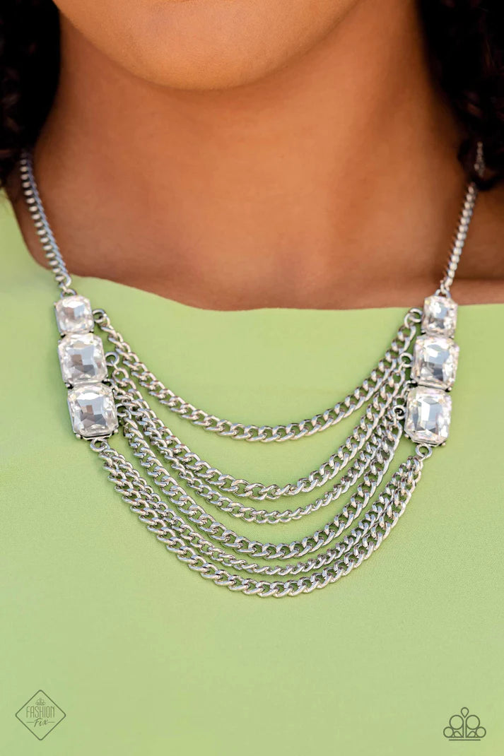 Layers of thick, silver curb chain drape across the chest, creating a fierce, industrial statement piece. Three blinding white, emerald-cut gems that gradually increase in size, are affixed to each side of the swooping chains, adding dramatic sparkle to the collision of grit and glitz. Features an adjustable clasp closure.