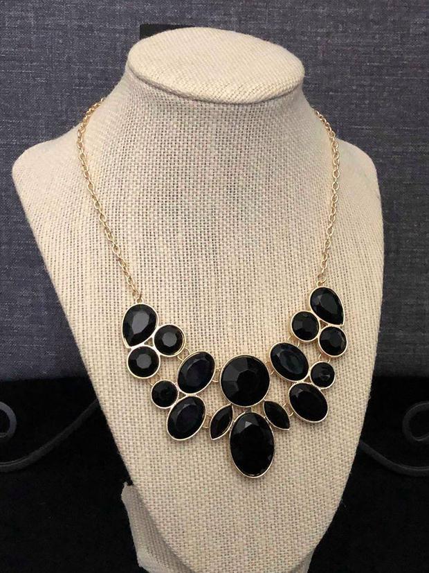 Featuring round, teardrop, and oval shapes, a collection of faceted black beads are pressed into sleek gold frames. The colorful frames link below the collar, creating a vibrant fashion. Features an adjustable clasp closure.