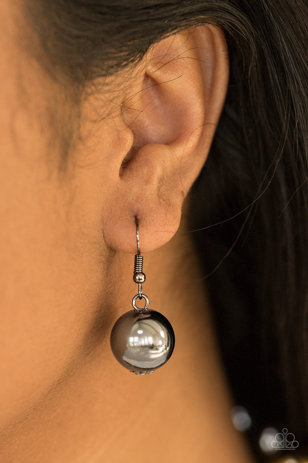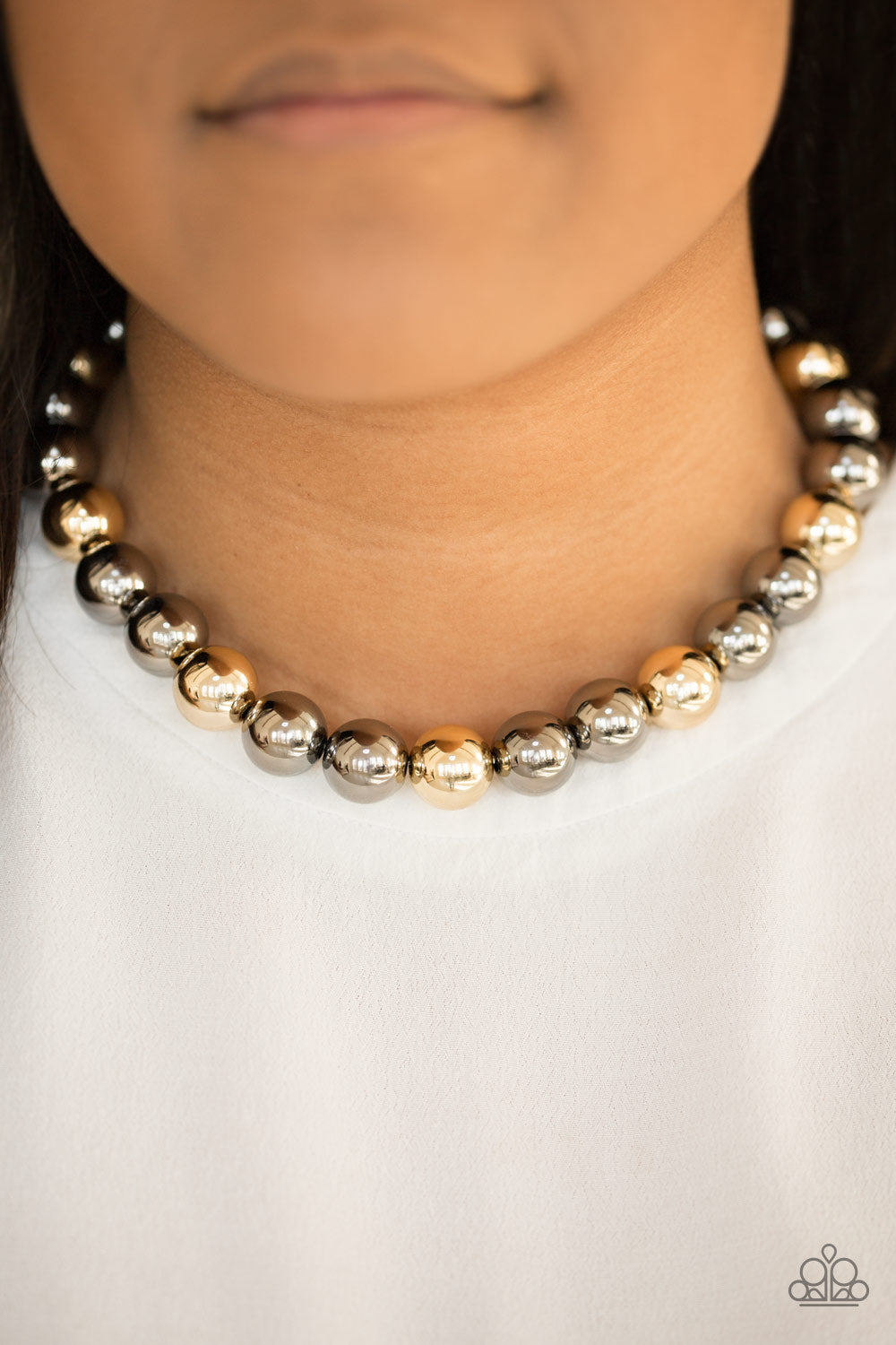 A strand of glistening gold and gunmetal beads drapes below the collar in a dramatic fashion. Features an adjustable clasp closure.