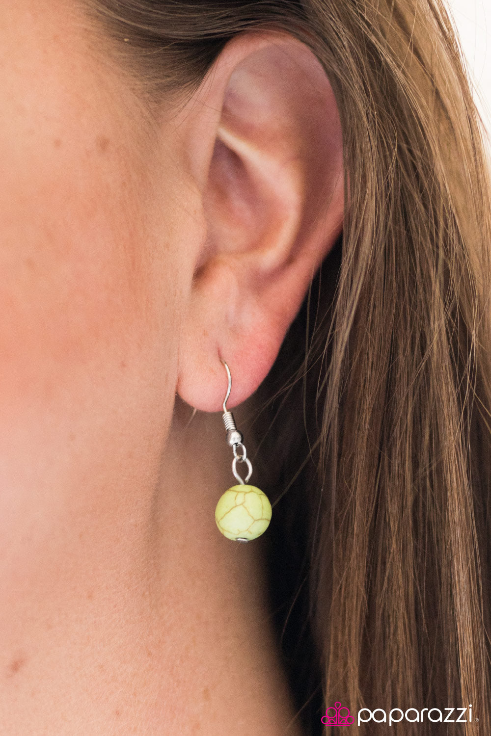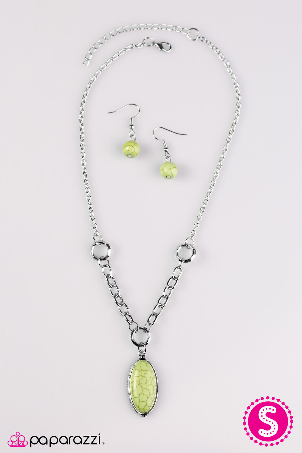 An elongated green stone swings from the bottom of a delicately hammered silver hoop. Enhanced with a section of dramatic silver chain, the vivacious pendant falls just below the collar in a seasonal fashion. Features an adjustable clasp closure.