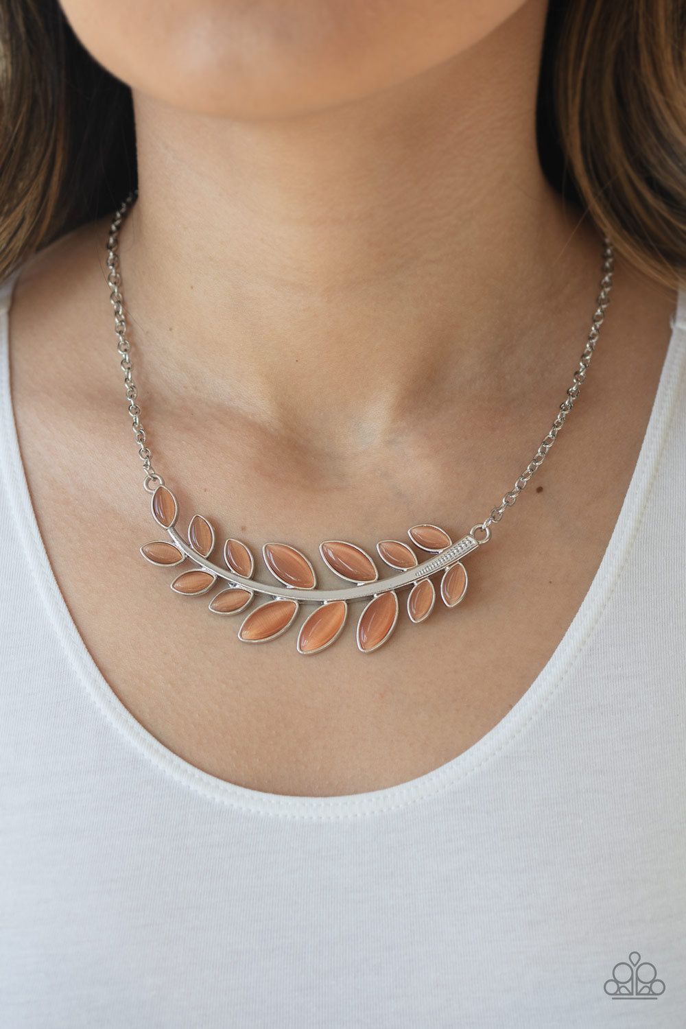 Dotted with tranquil orange cat's eye stones, a leafy silver branch delicately curves below the collar for a whimsical look. Features an adjustable clasp closure.