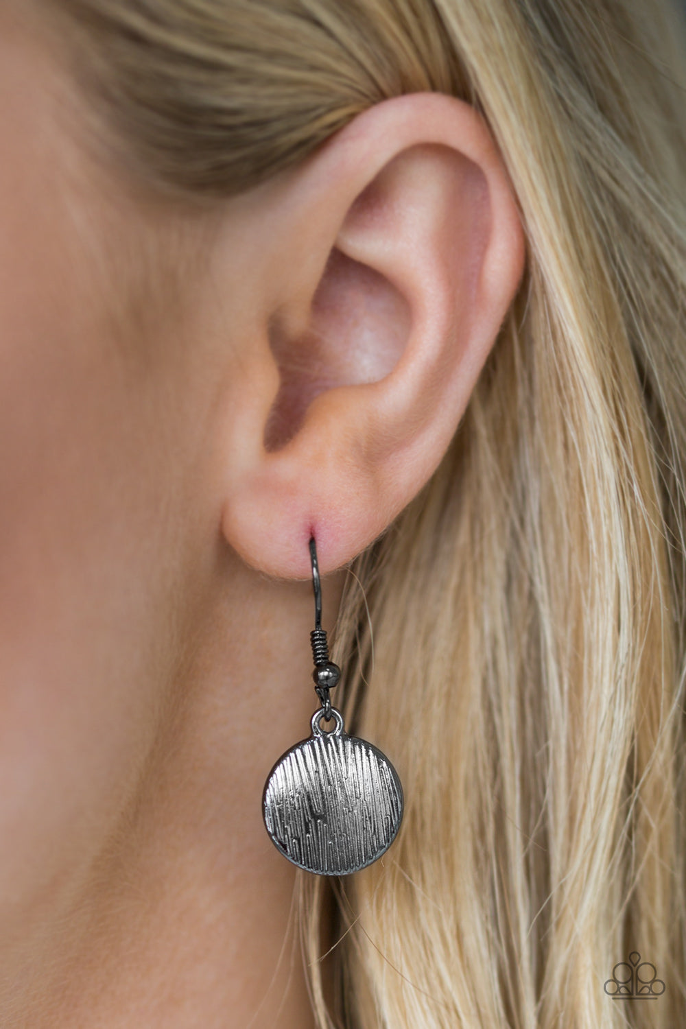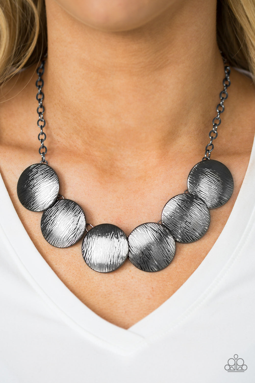 Embossed in shimmery linear patterns, round gunmetal frames link below the collar for a bold industrial look. Features an adjustable clasp closure.