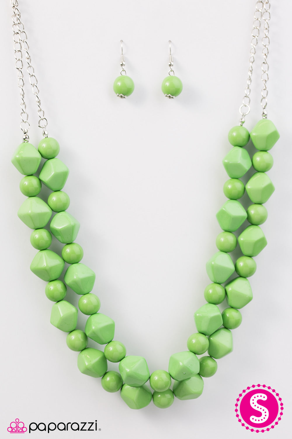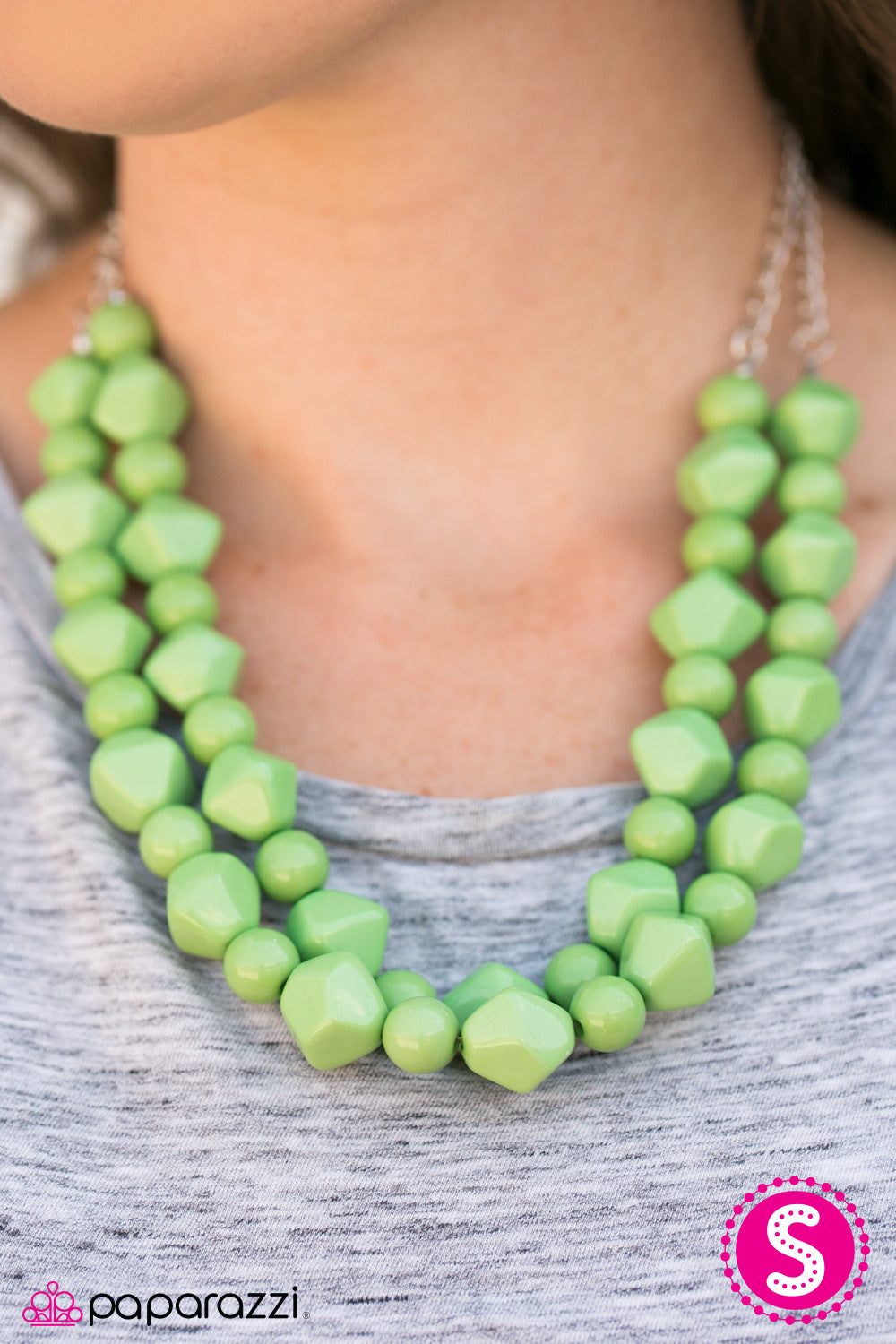 Tinted in a minty hue, refreshing green beads featuring round and abstract shapes layer into two colorful tiers below the collar. Features an adjustable clasp closure.