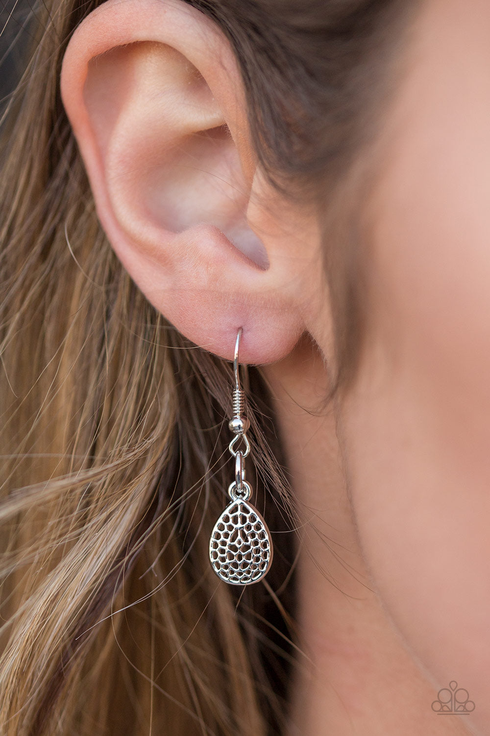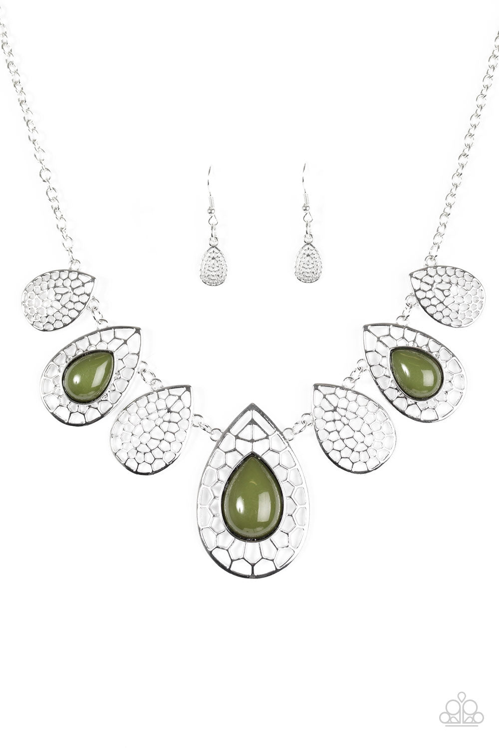 Filigree filled silver teardrops link below the collar in a seasonal fashion. Refreshing green teardrop beads are pressed into the airy frames, adding a splash of color to the tribal inspired palette. Features an adjustable clasp closure.