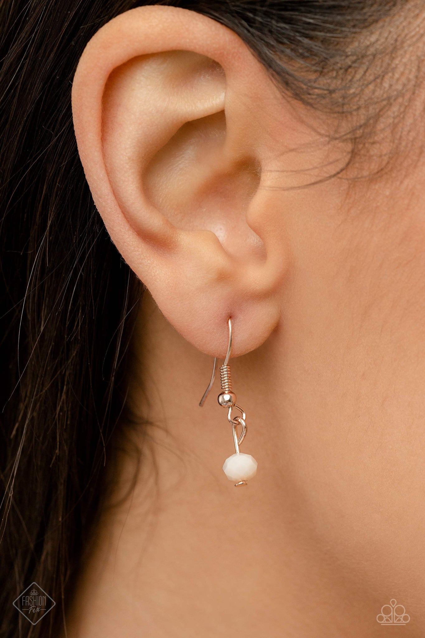 Shimmery strands of rose gold layer across the chest, emitting a cozy glow. The top strand features a collection of white stones, which lays above a row of faceted light pink beads alternating with shimmery rose gold accents. The lowermost strand is lined with faceted pink beads in varying opacities, from which a rose gold disc engraved with a lotus flower emerges. As the stone elements in this piece are natural, some color variation is normal.