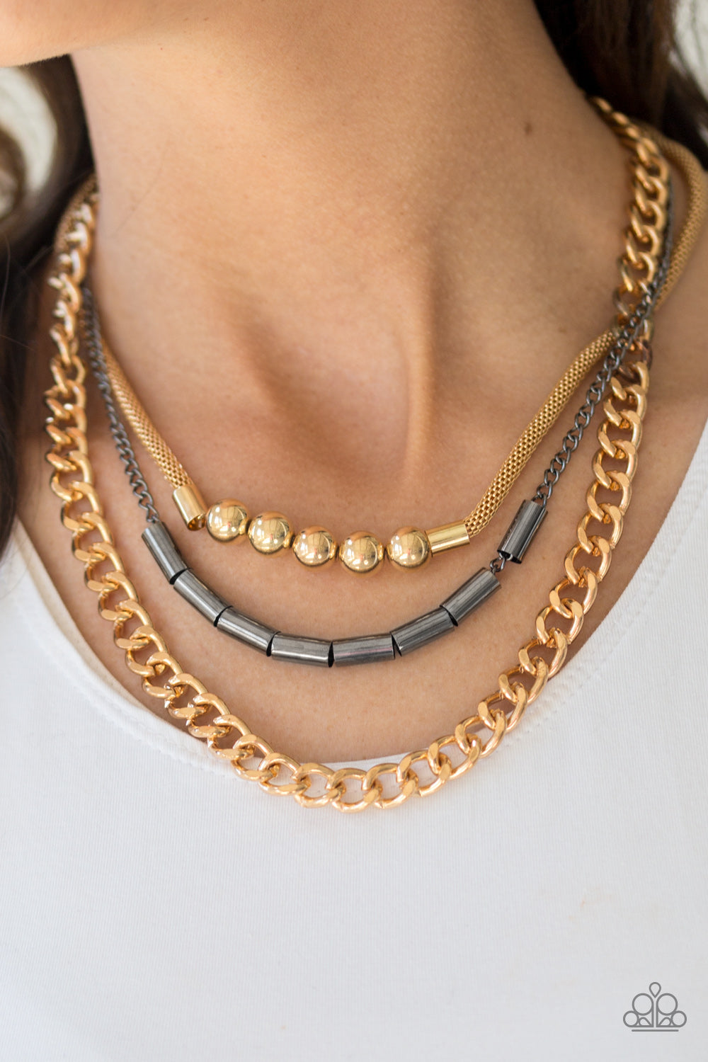 A classic gunmetal chain, rounded gold mesh chain, and bold gold chain layer below the collar. Round and cylindrical beads slide along the mismatched chains, creating bold layers below the collar. Features an adjustable clasp closure.