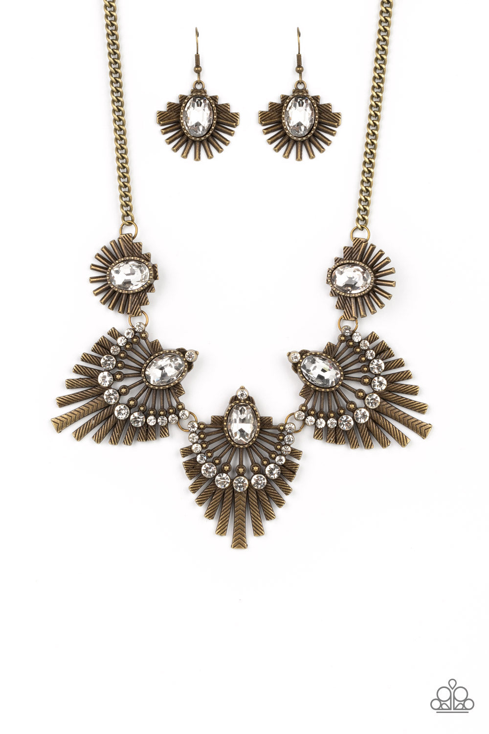 Textured metal bars flare out from a mesmerizing white rhinestone, creating a fringe of fanning frames. Sprinkled with white rhinestones, the dazzling display falls just below the collar for a sassy finish. Features an adjustable clasp closure