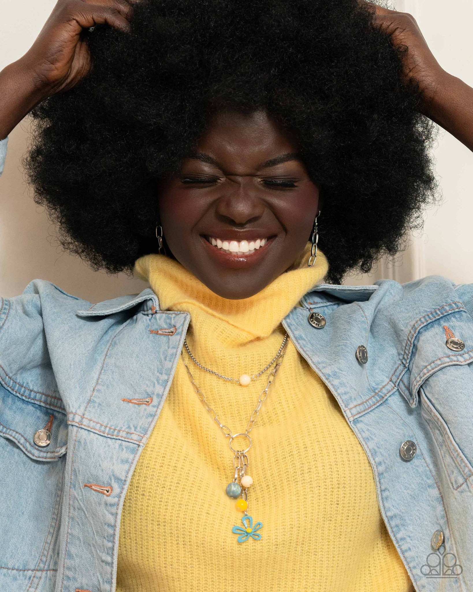 Accented with multicolored swirls, an ivory bead and yellow bead joins an abstract Persian Jewel flower with a yellow center at the bottom of a lengthened silver paperclip chain, creating a noisy charm. A dainty silver box chain, infused with the same three beads layers above the extended display for additional eye-catching color. Features an adjustable clasp closure.
