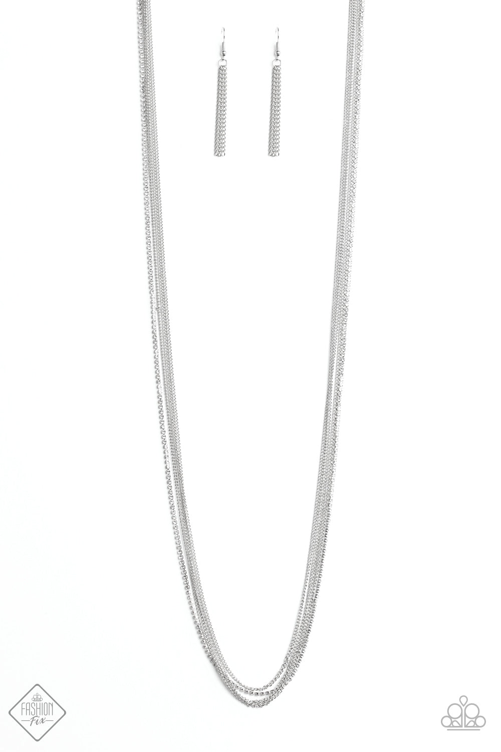 Featuring sleek square fittings, a glittery strand of white rhinestones is nestled among streaming strands of glistening silver chains that fall down the chest in a refined finish. Features an adjustable clasp closure.