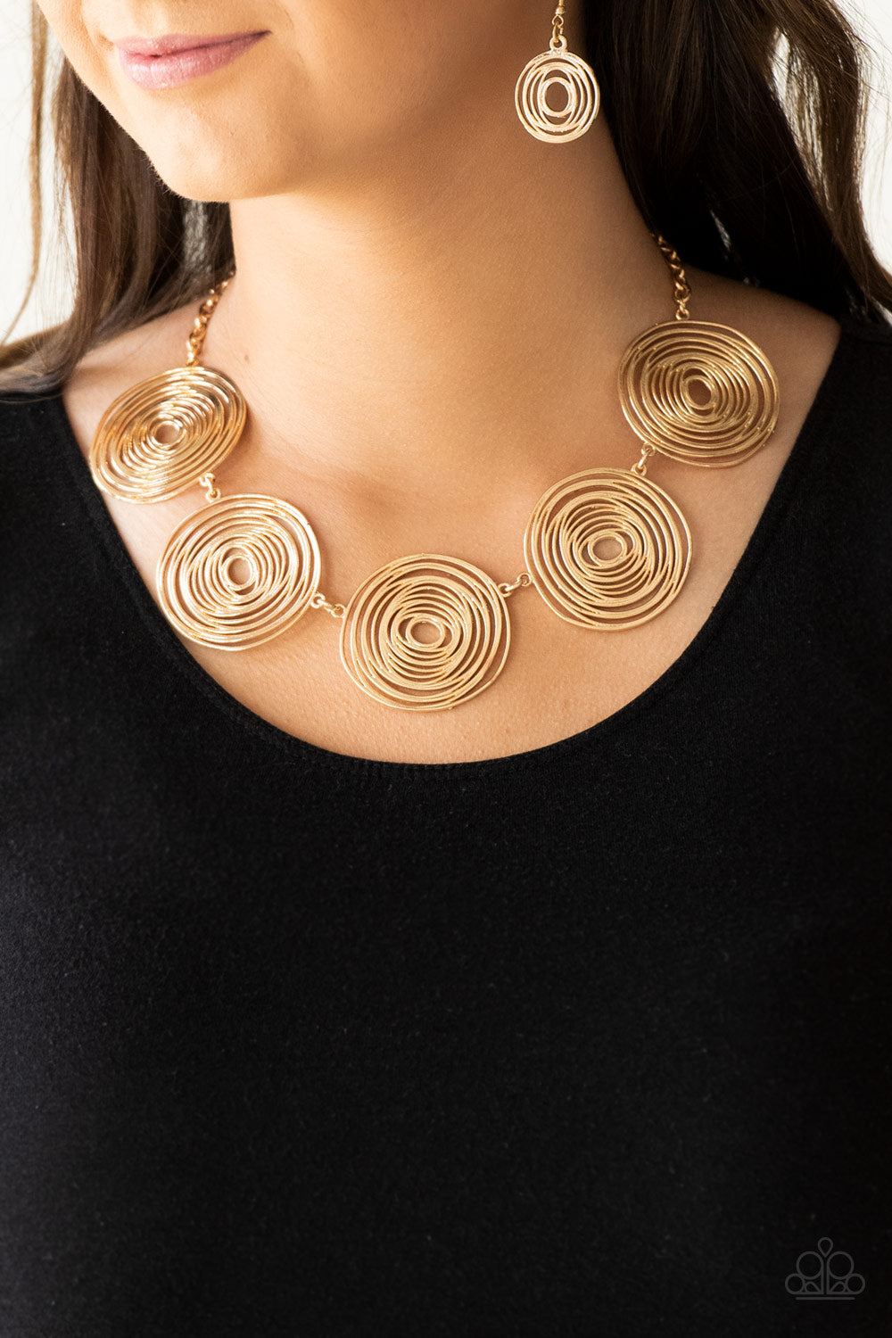 Brushed in a high-sheen finish, swirling gold frames link below the collar for a seasonal look. Features an adjustable clasp closure.