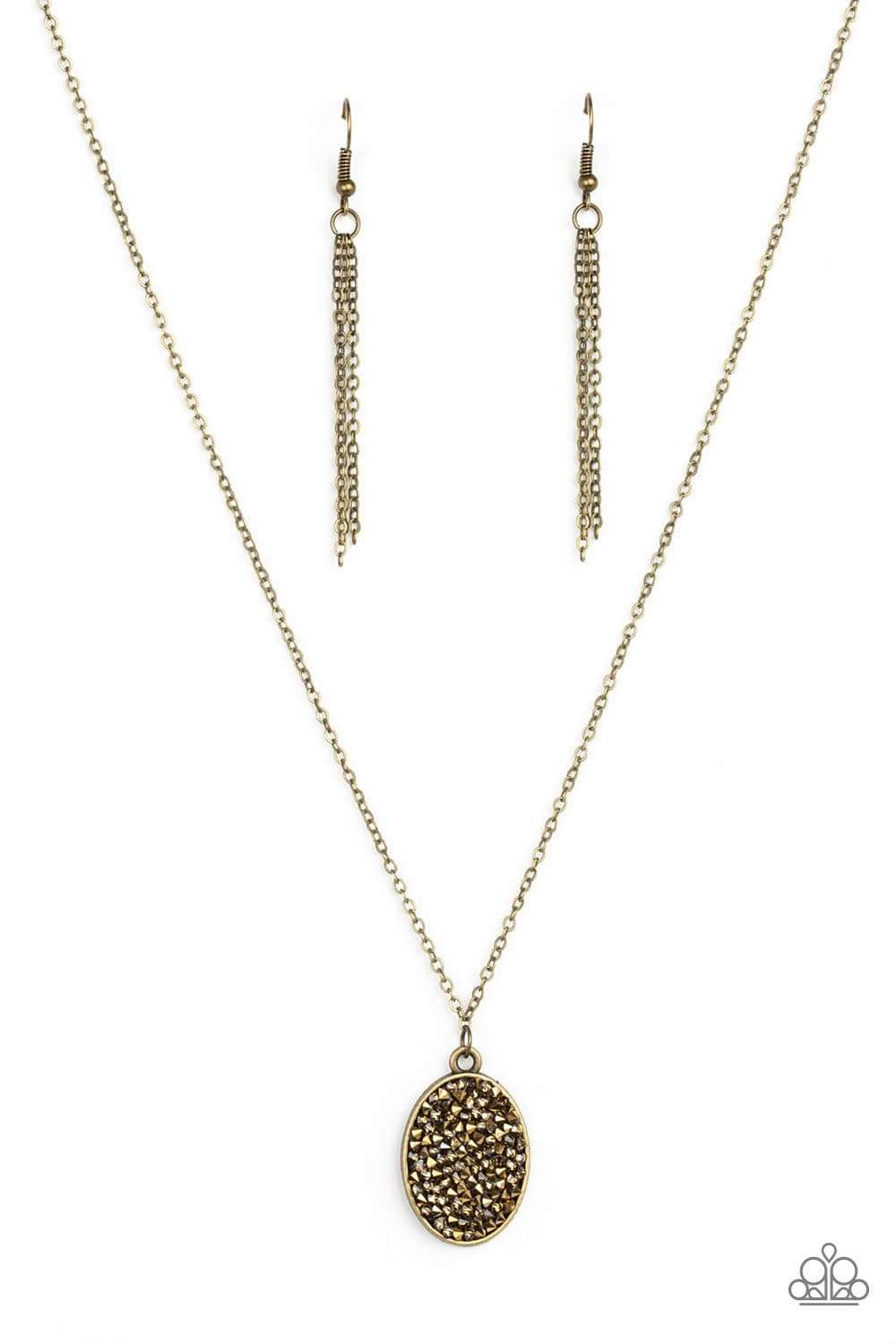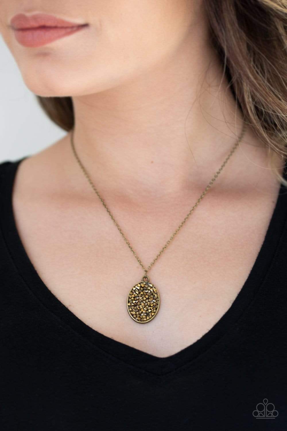 Necklace with glittery aurum and golden topaz rhinestones are sprinkled along an oval brass frame, creating a stellar pendant below the collar. Features an adjustable clasp closure.