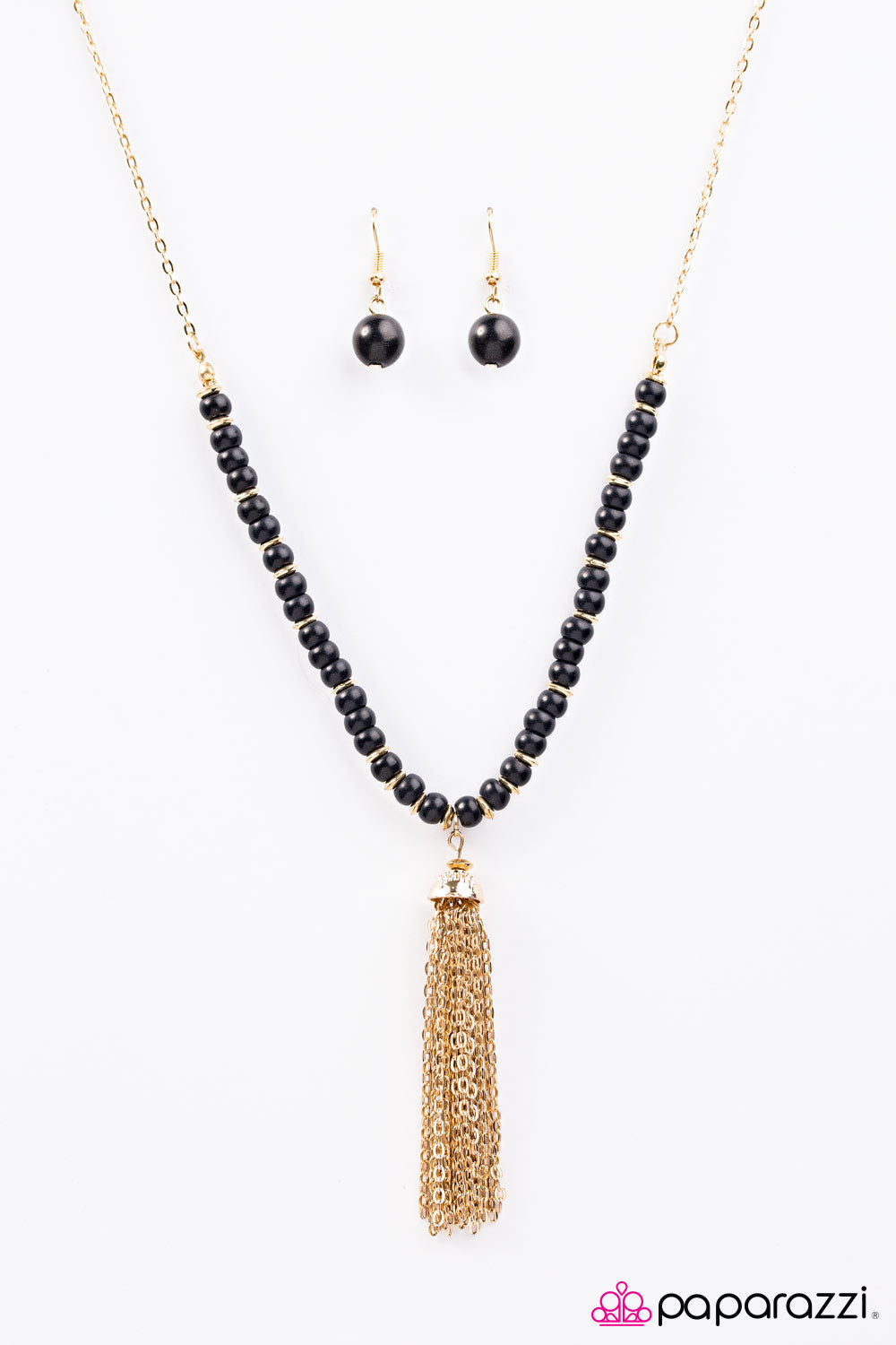Earthy black stones and shiny gold accents give way to a gold chain tassel for an artisan inspired fashion. Features an adjustable clasp closure.