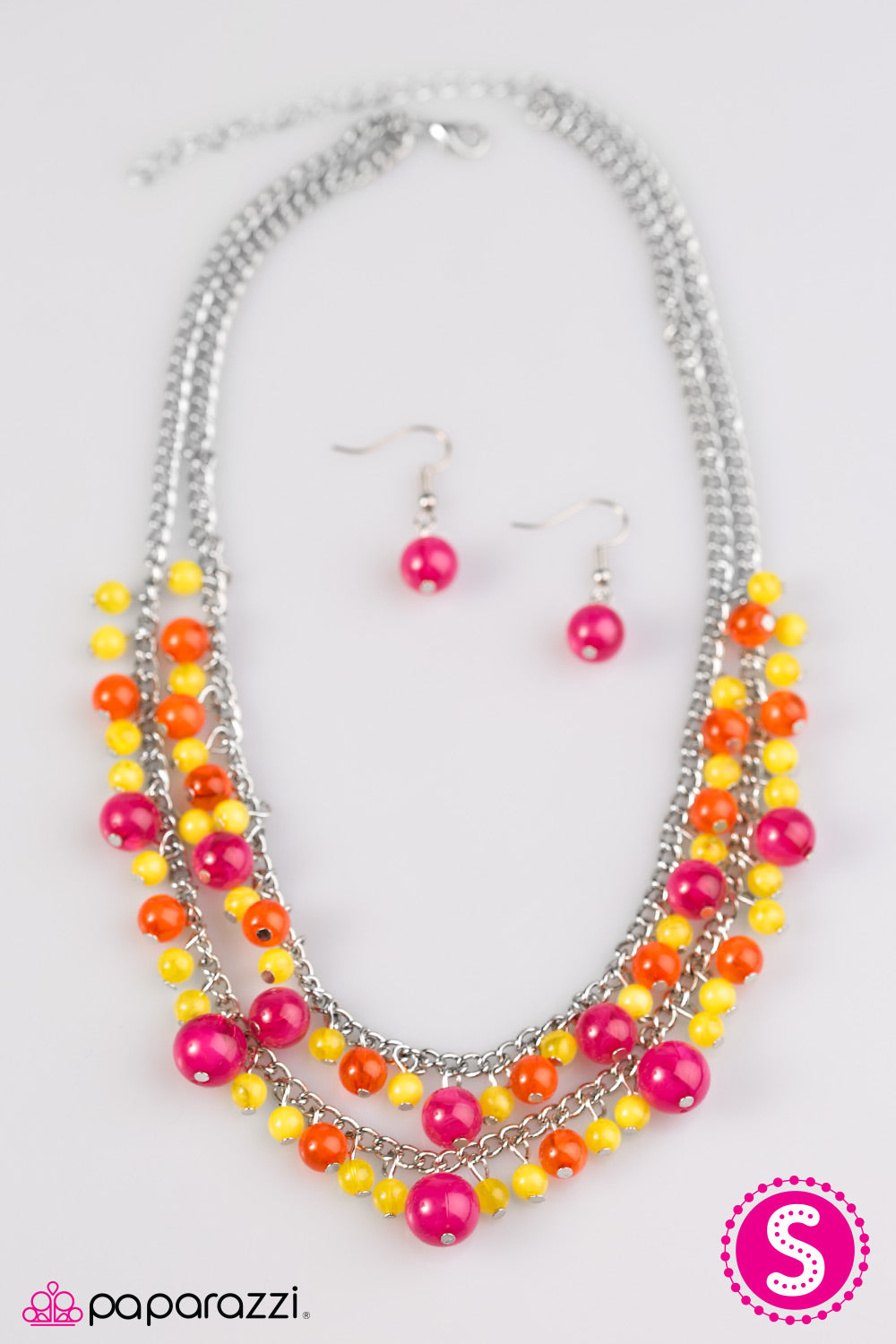 Glassy pink, yellow, and orange beading trickles along two shimmery silver chains, creating colorful layers below the collar. Featuring a variety of opacity and size, the gorgeous beading falls into a summery inspired fashion. Features an adjustable clasp closure.