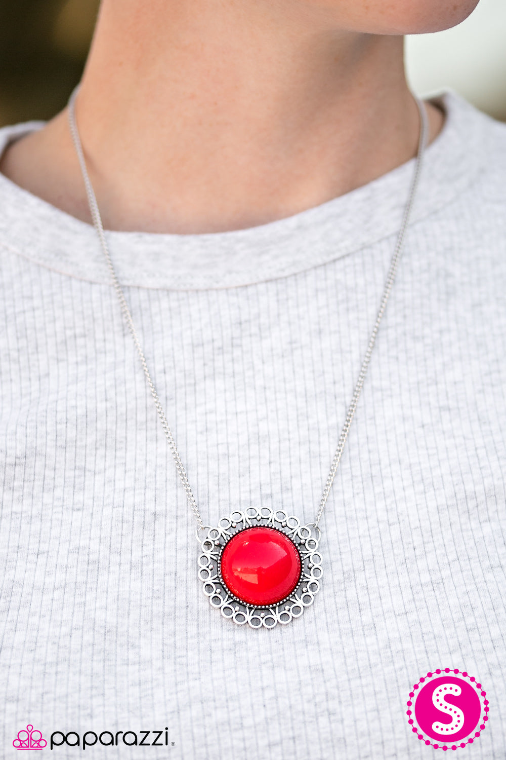 A bright red bead is pressed into the center of a frilly silver frame, creating a dramatic pop of color below the collar. Features an adjustable clasp closure.