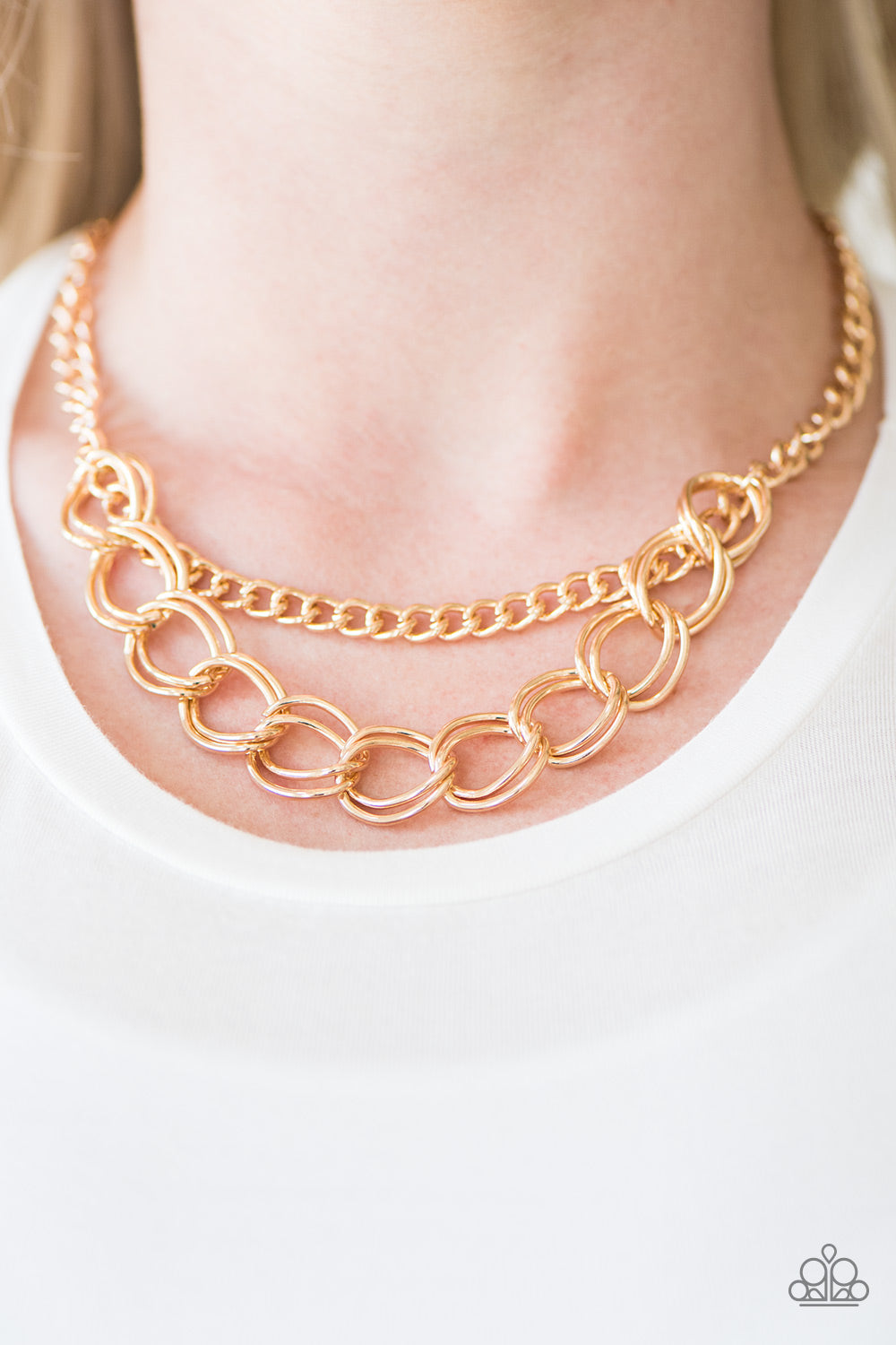 A row of doubled gold links joins below a row of glistening gold chain, creating bold layers below the collar for a fierce look. Features an adjustable clasp closure.
